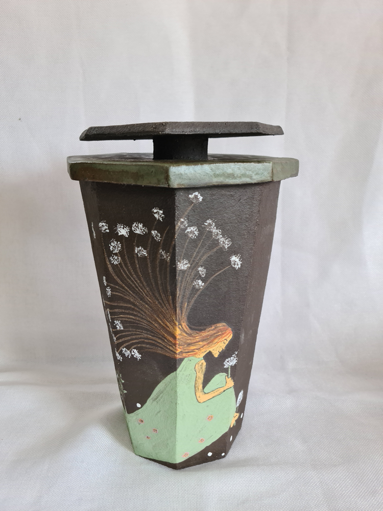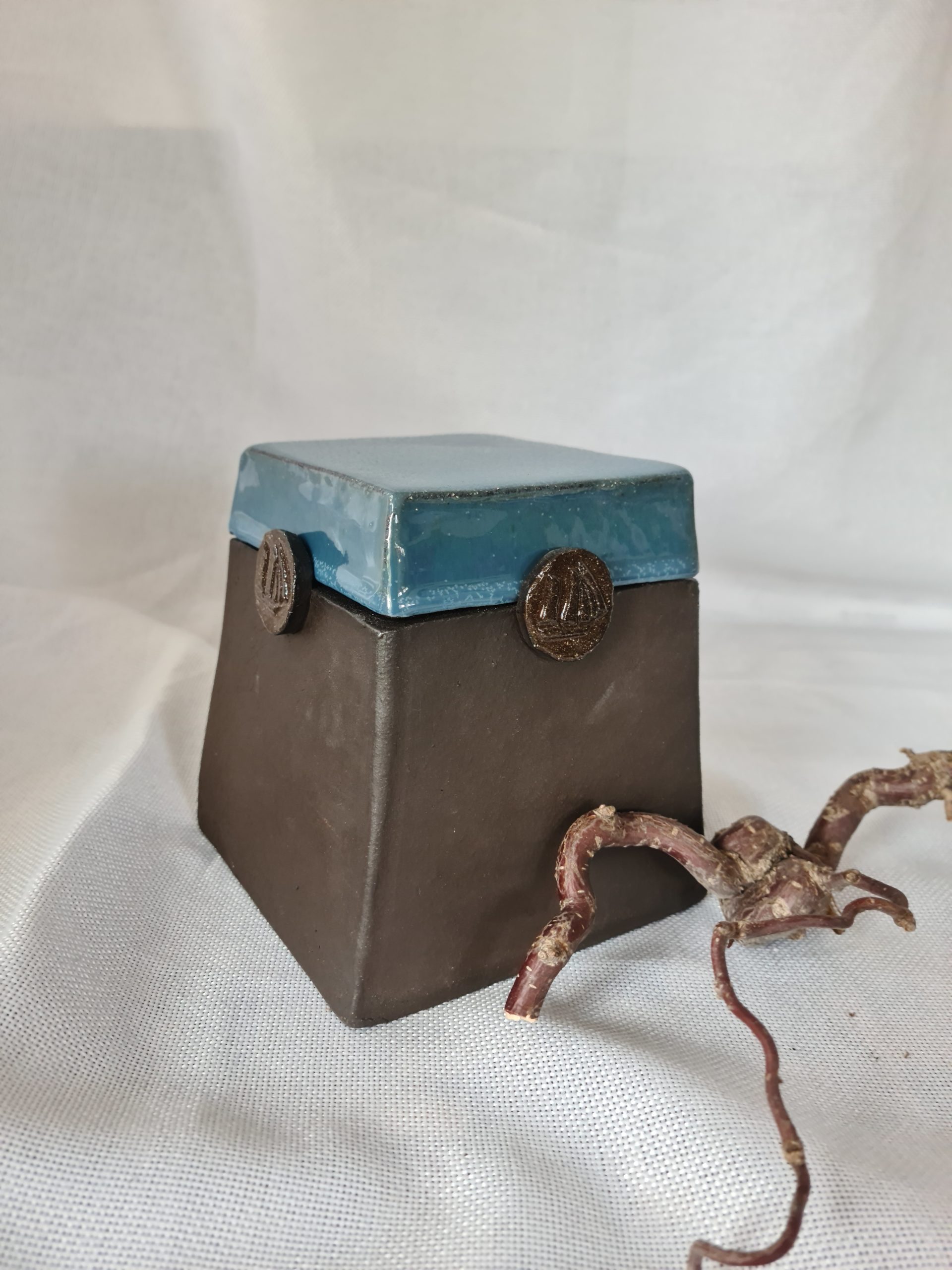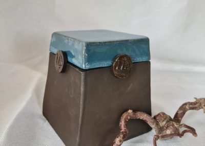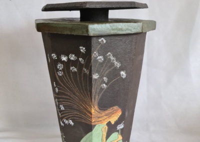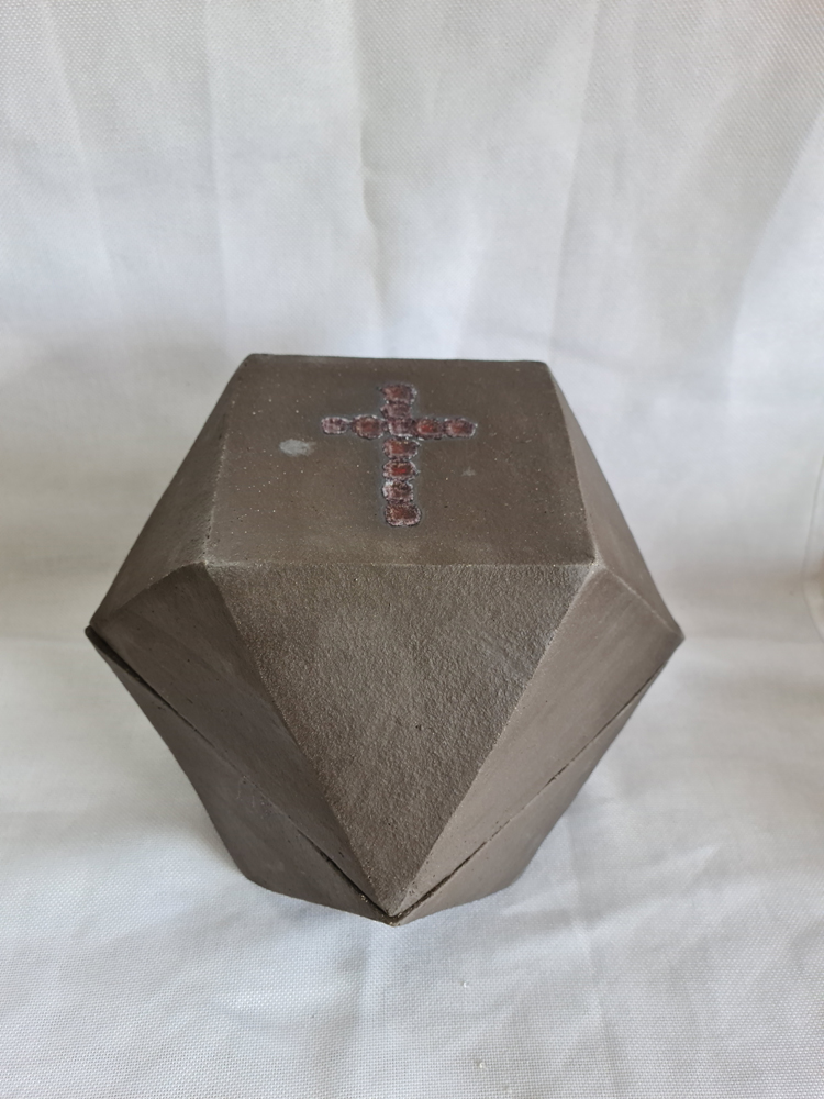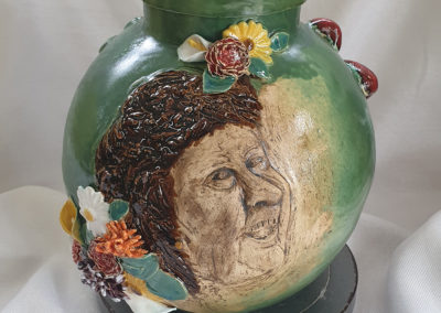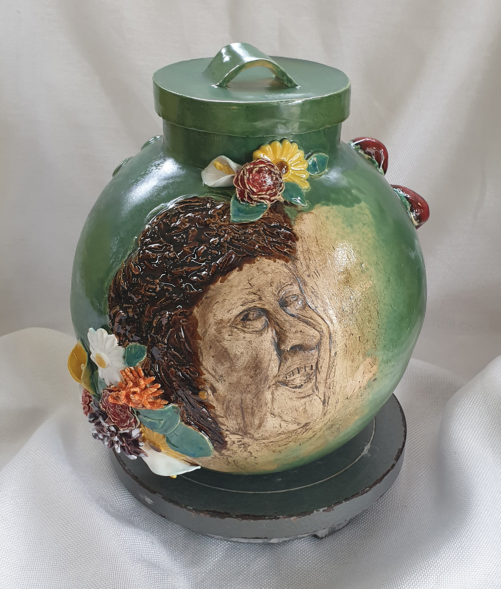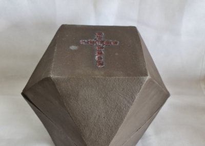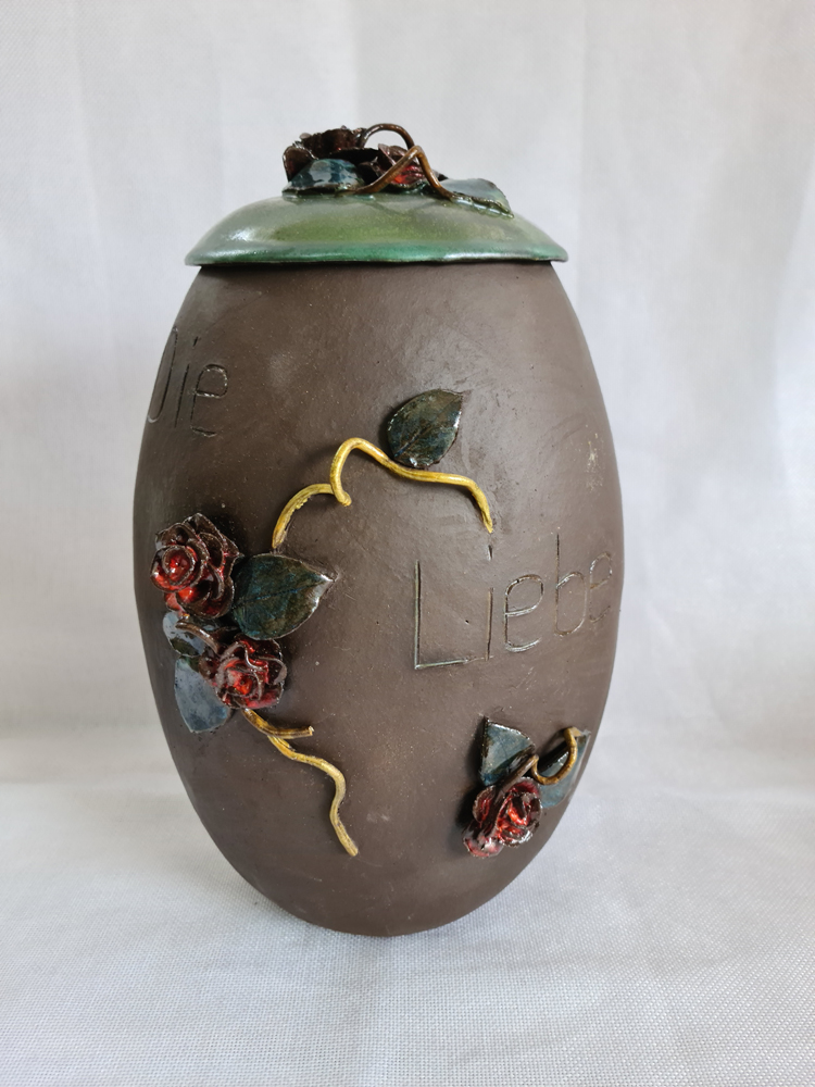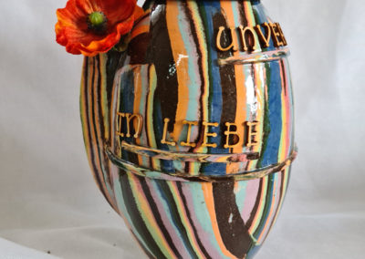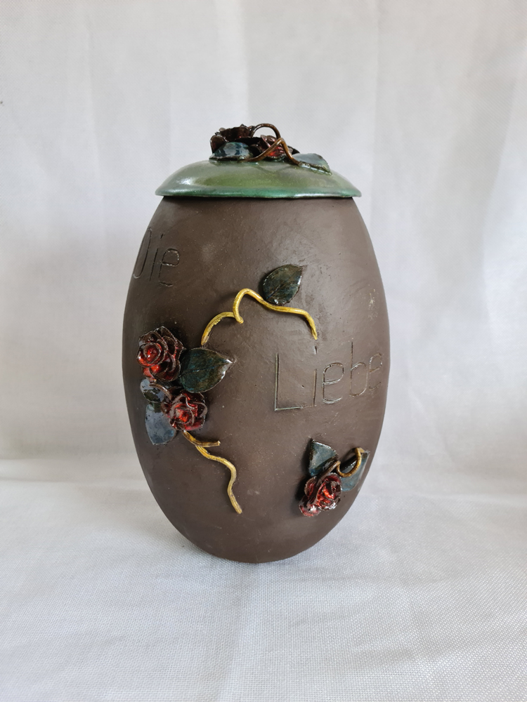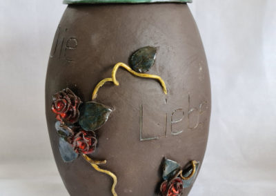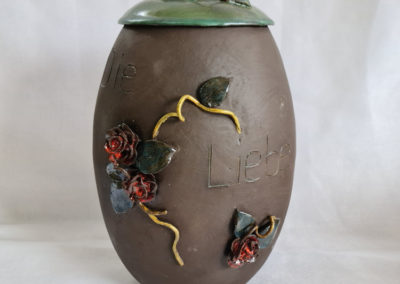 Die Struktur der Oberfläche, die individuellen Motive sind die besonderen Merkmale meiner Urnen. Der keramische Brand bei den Urnen findet bei Niedrigtemperatur statt, (halbgebrannt) somit ist die Keramik wasseraufnahmefähig, und im Erdreich vergänglich. Die Farbgebung erfolgt durch Pinselauftrag, sowie Glasur mit natürlichen Farben. Meine zweiteiligen Urnen werden verklebt.